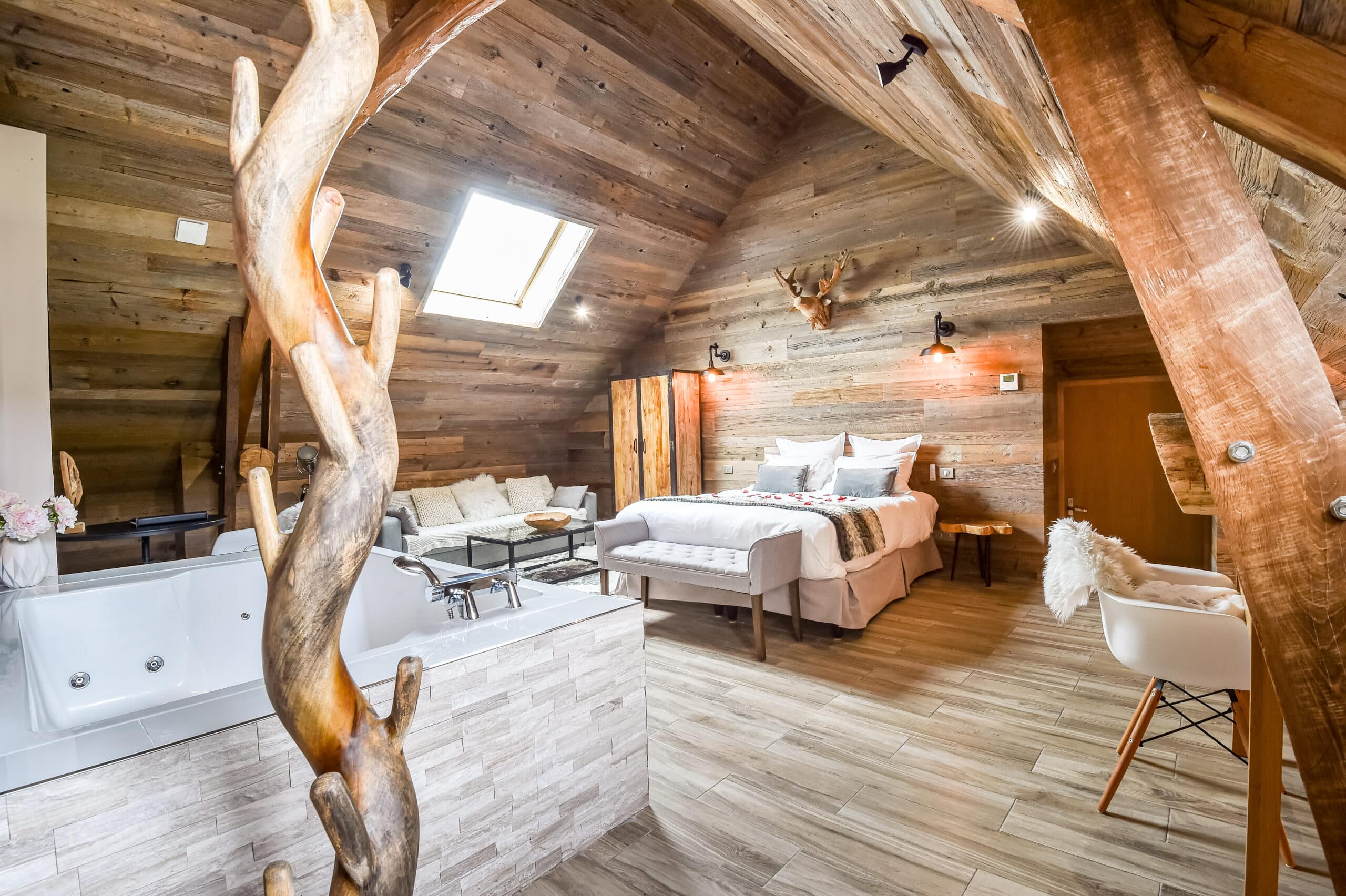 Plongez dans l’univers chaleureux de la Suite Megève, un véritable cocon romantique inspiré des chalets de montagne. Avec ses murs en bois noble, ses lumières tamisées et son jacuzzi® privatif, cette suite avec spa privatif est idéale pour un week-end en amoureux proche de Paris.